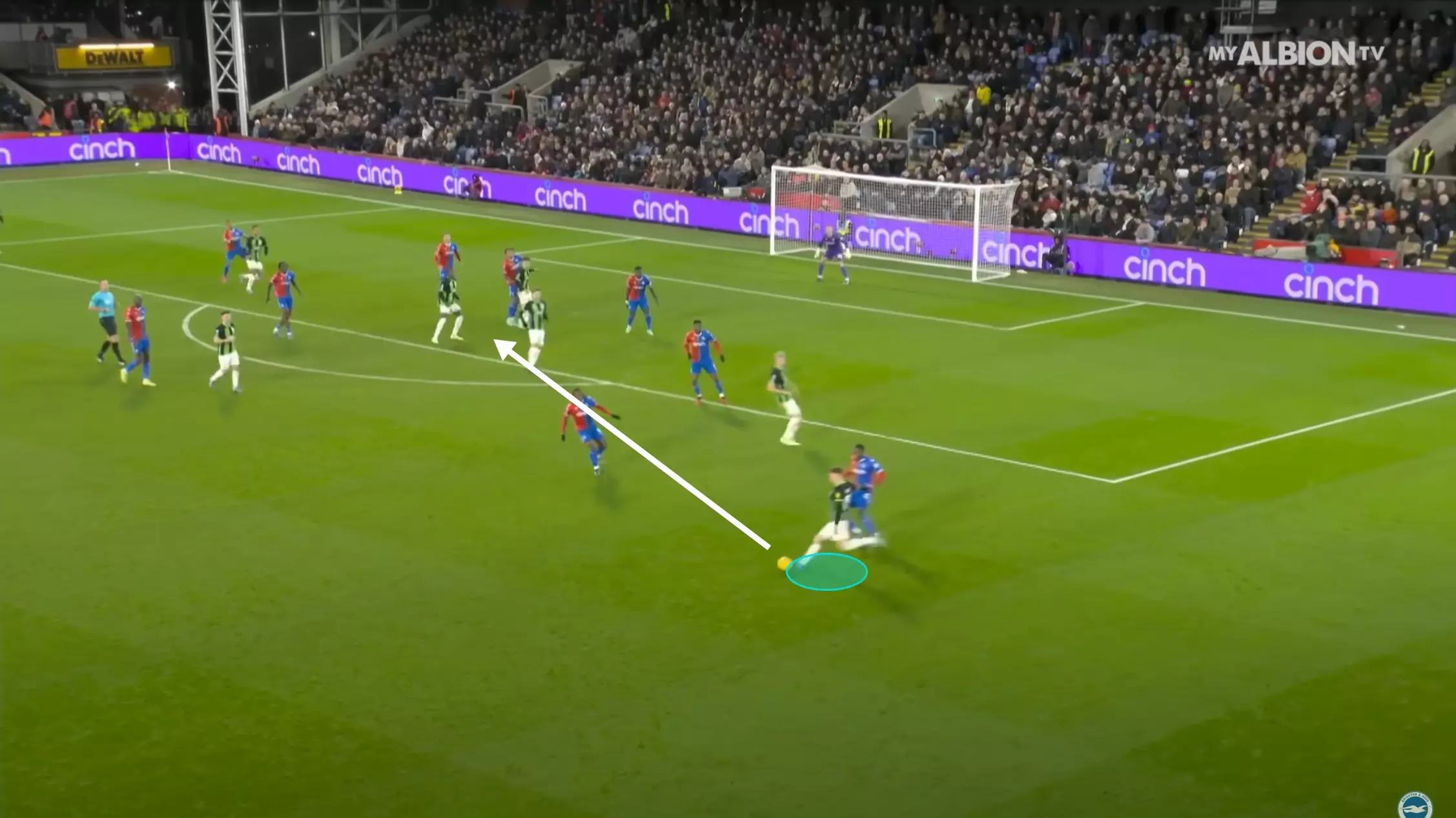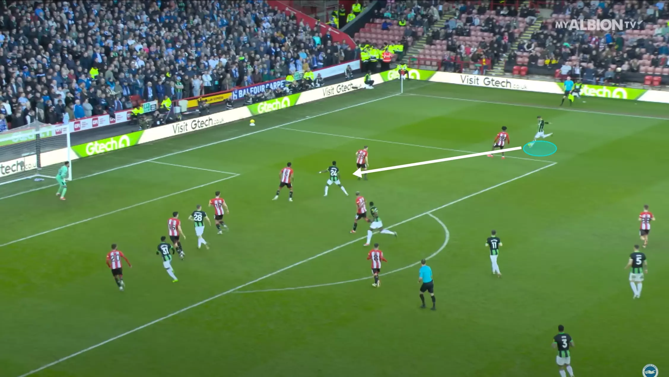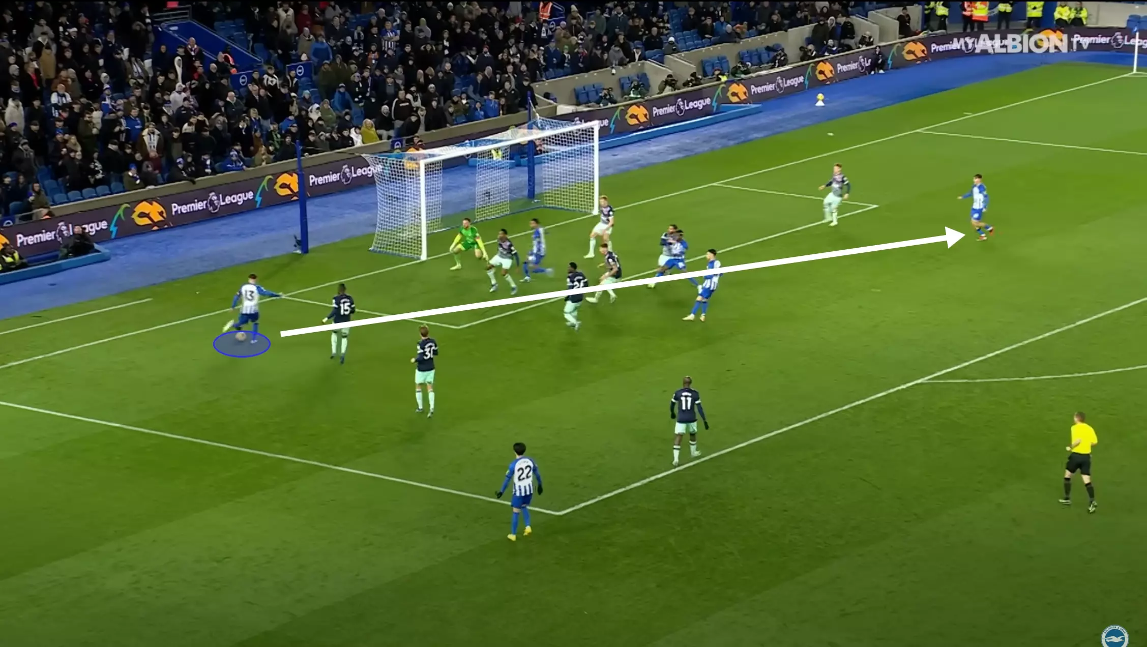 … and from short corner routines, like his assist against Stoke City where he found Dunk’s acute run after receiving a quick bounce pass from his teammate.